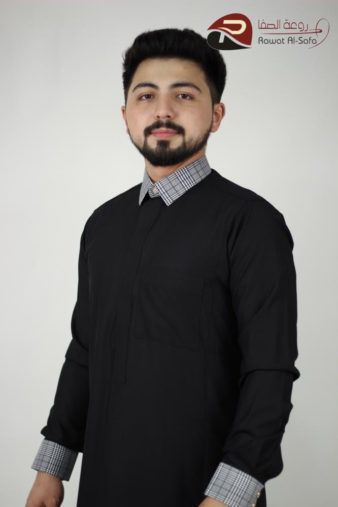 ثوب رجالي خامة تي ار فيسكوز الياقة قلاب والكم كبك زبزور سحاب والياقة والكم مطعُم كاروهات يتوفر منه اللون الأسود والقماش خفيف صيفي